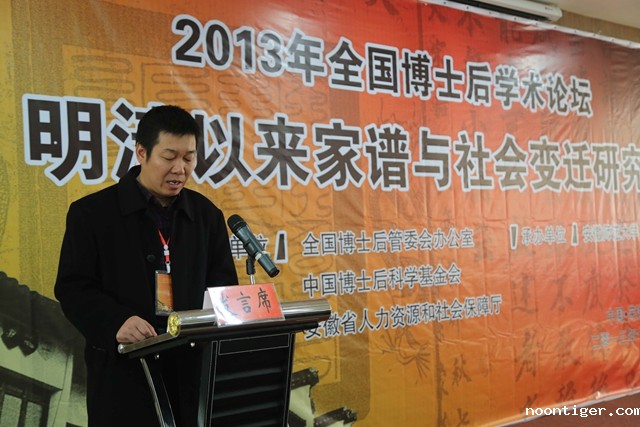 2013年11月20日,由全国博士后管委会办公室、中国博士后科学基金会、安徽省人力资源和社会保障厅主办,安徽师范大学承办的2013年全国博士后学术论坛“明清以来家谱与社会变迁研究”在我校举行。安徽省人力资源和社会保障厅副厅级巡视员潘亚群同志、北京师范大学瞿林东教授、中国社会科学院栾成显研究员、厦门大学陈支平教授、中国社会科学院历史研究所所长卜宪群研究员、南京大学范金民教授、首都师范大学李华瑞教授、南开大学常建华教授、复旦大学王振忠教授、中国社会科学院阿风研究员、河北大学刘秋根教授、高等教育出版社徐松巍教授、光明日报社记者户华为同志、安徽省人社厅专技处秦正义处长、专技科科长占家礼同志、安徽省社会科学院《安徽史学》主编陈瑞研究员、中国社会科学报记者吴楠同志、我校副校长李琳琦教授、人事处处长季爱新同志、科研处处长陆林教授、研究生学院院长胡传志教授、历史与社会学院院长徐彬教授、副院长刘道胜教授和戴卫东教授等,以及全国25所高校和科研机构的博士后、博士等应邀出席开幕式。潘亚群同志、李琳琦教授、徐彬教授分别致开幕辞。开幕式由我校原副校长王世华教授主持。